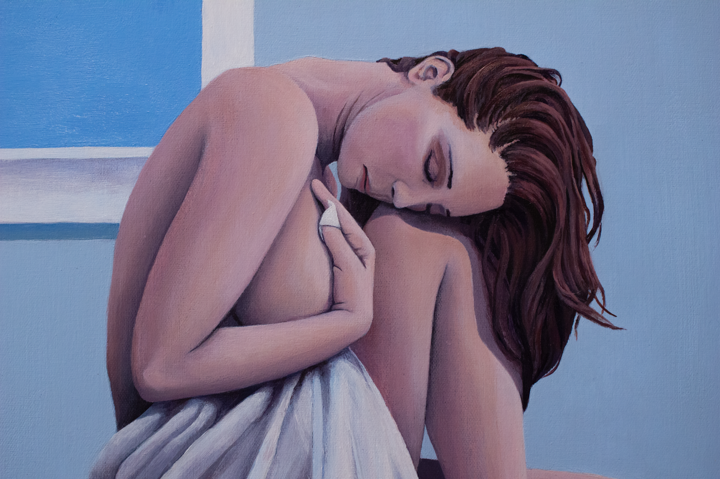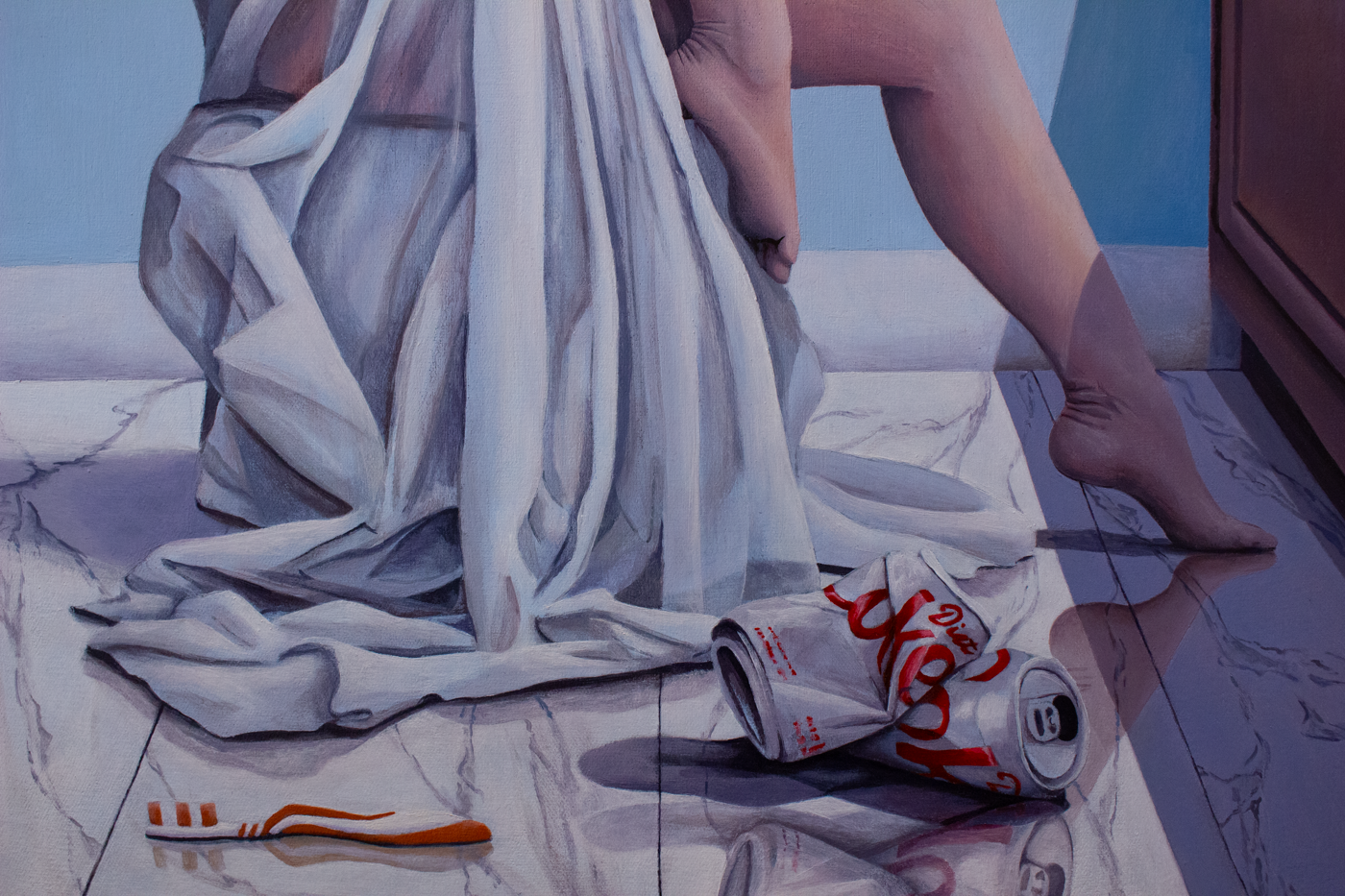 a woman lays on the ground of an above ground floor in a modest house. she is draped in white cloth from head to toe. her feet, hand and head are exposed. Her face is hidden from the viewer due to her hair.