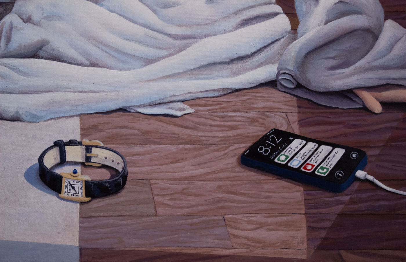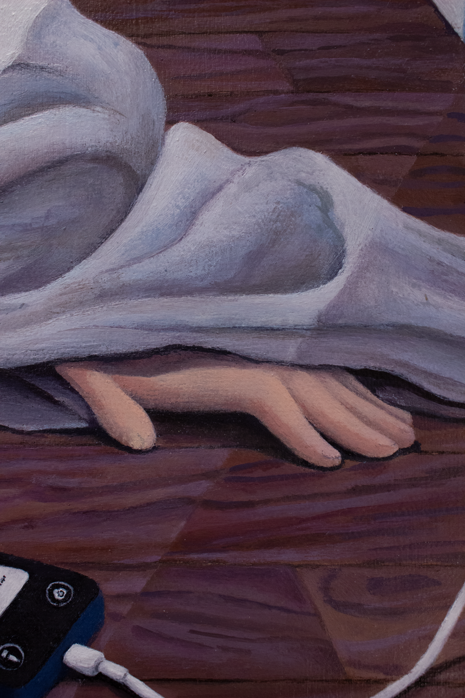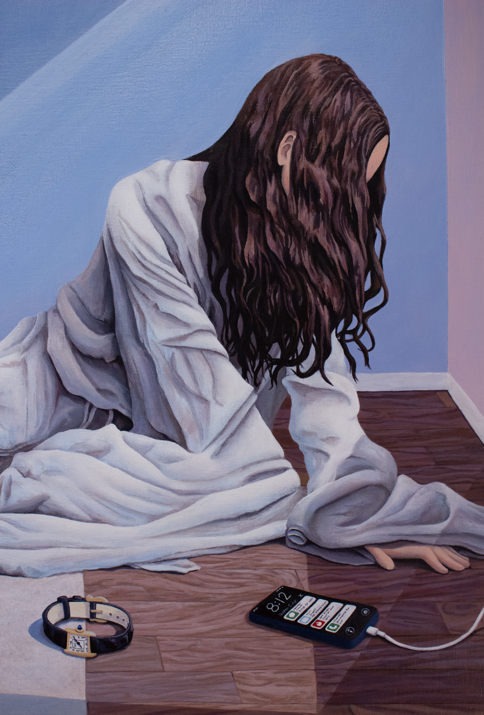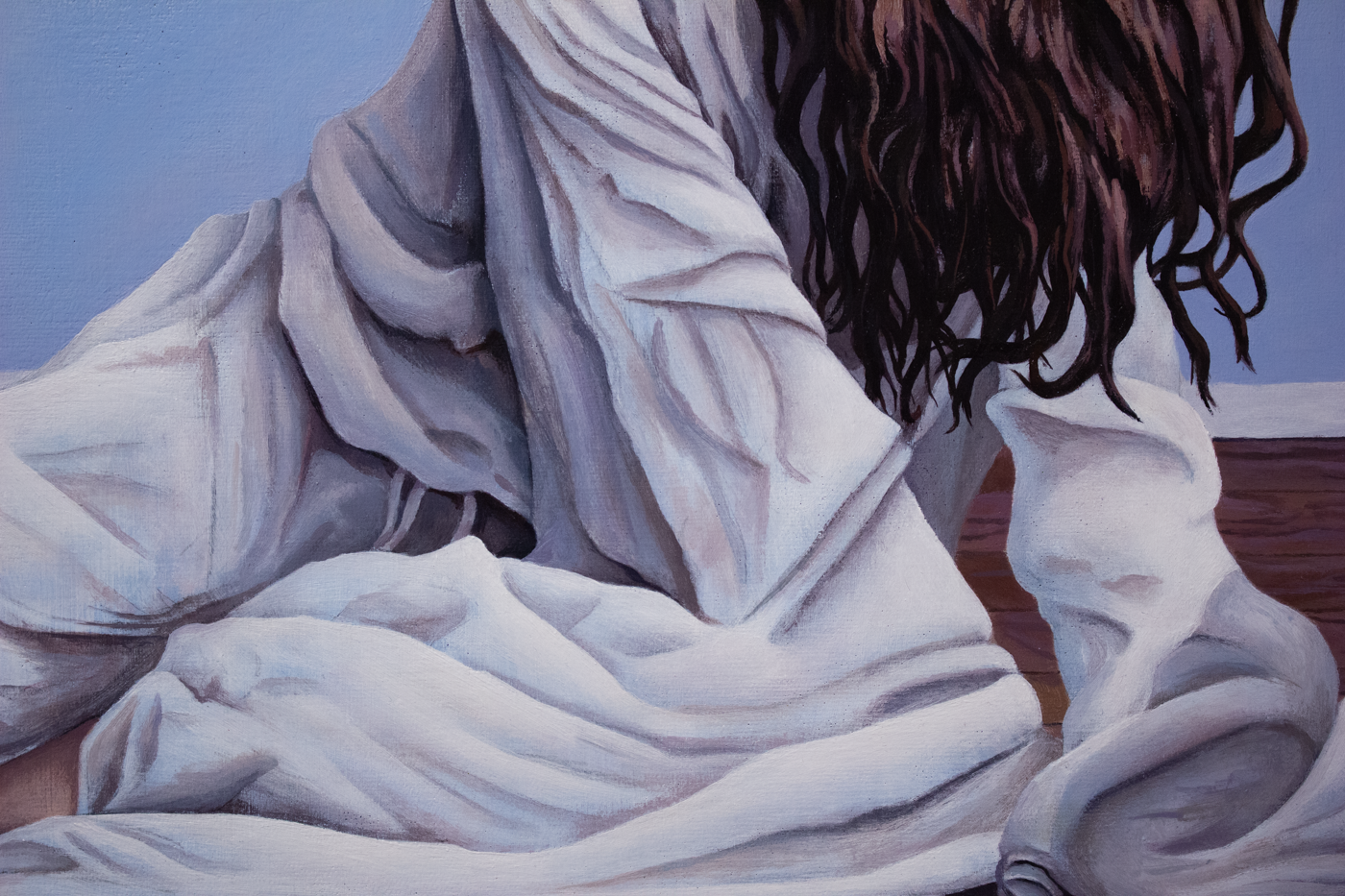 a woman lays on the ground of an above ground floor in a modest house. she is draped in white cloth from head to toe. her feet, hand and head are exposed. Her face is hidden from the viewer due to her hair.