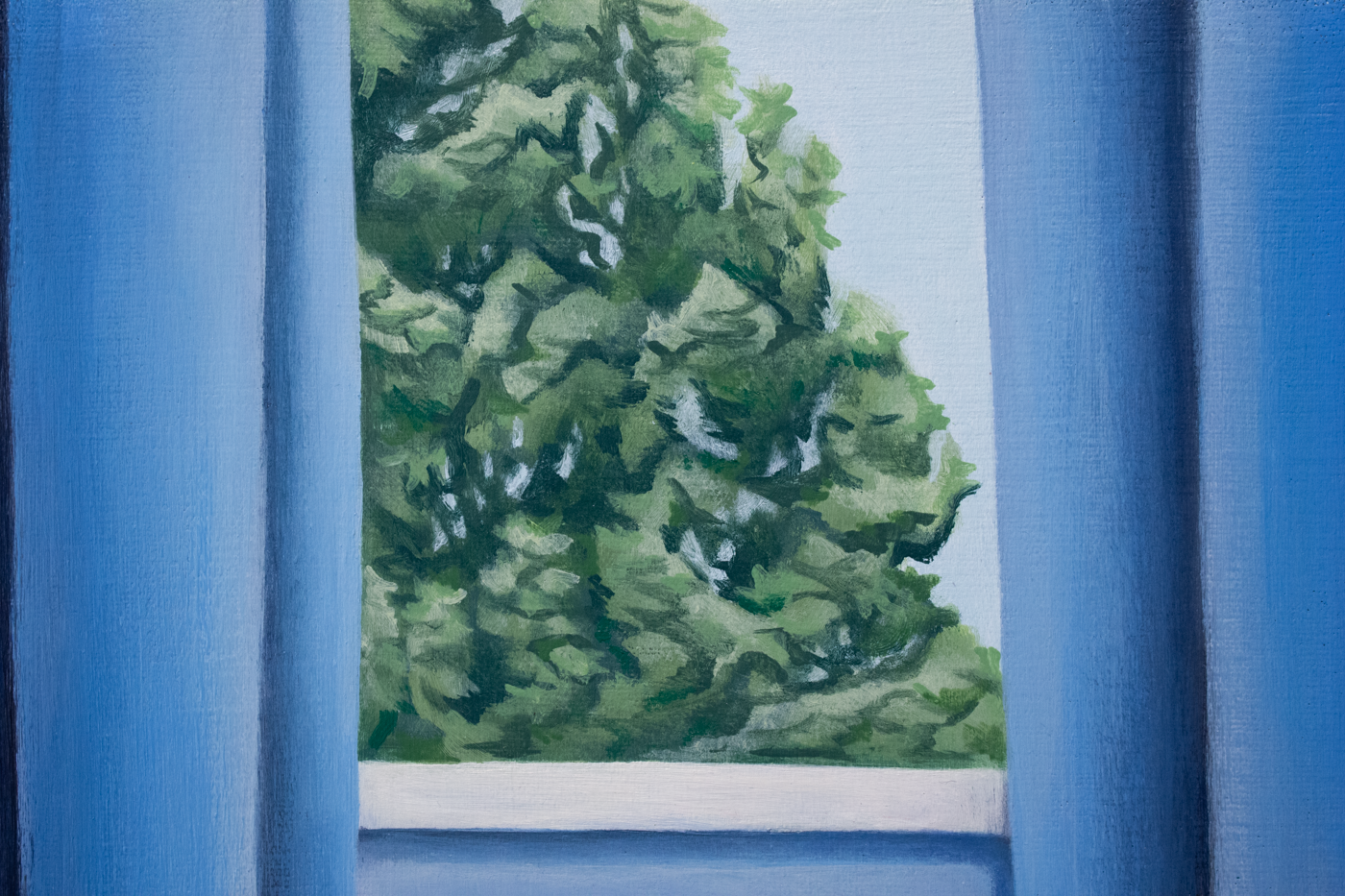 the top of a tree is illuminated through a window on the back wall of the room. both windows are flanked by blue curtains.