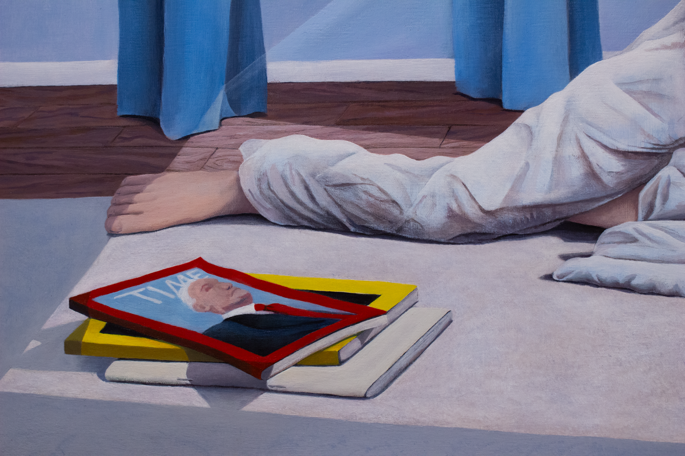 the sun infiltrates the room and floods the floor where she is laying, creating a harsh crop around her body. a stack of magazines lies at her feet, displaying Donald Trump’s 2025 TIME Magazine cover on top.